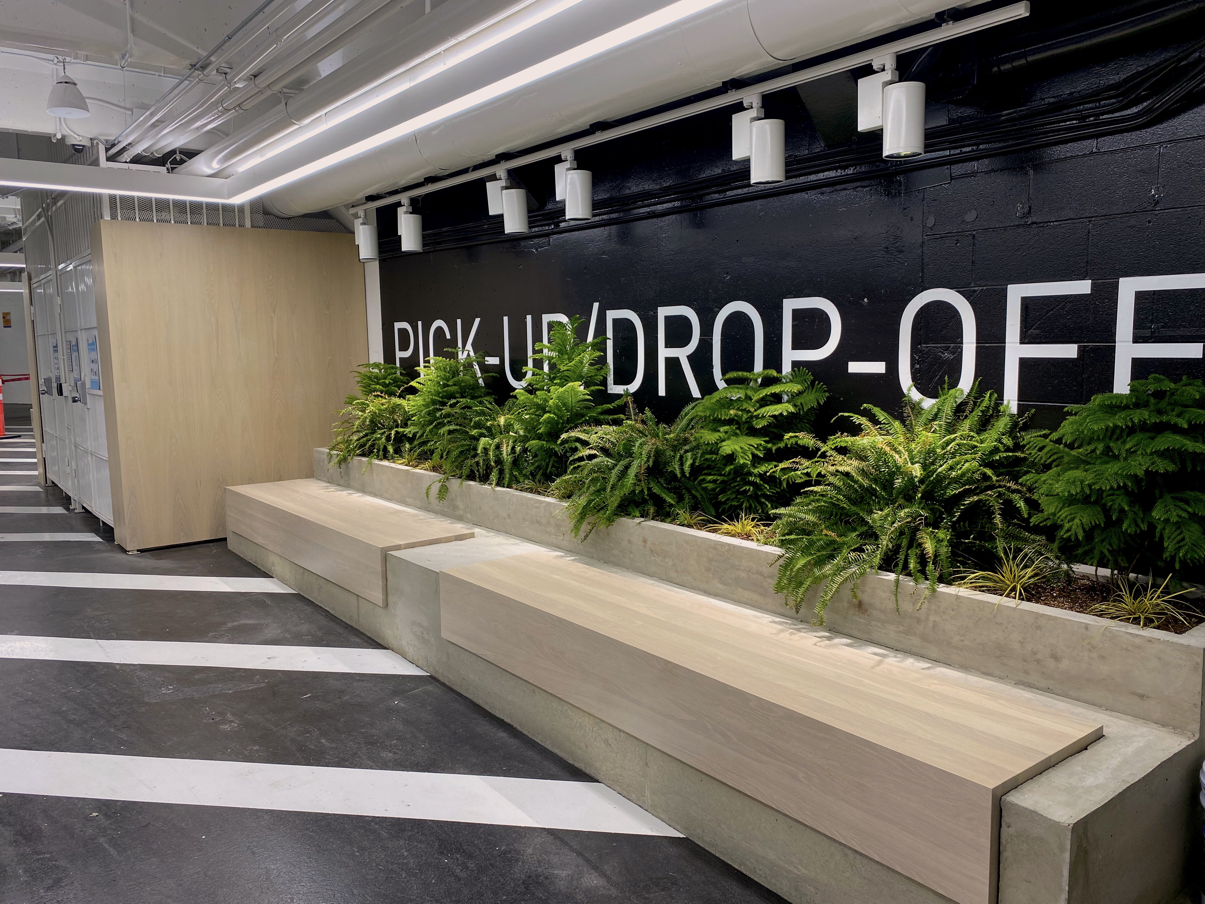 2” solid oak benches recessed into concrete with oak veneer surrounds. .