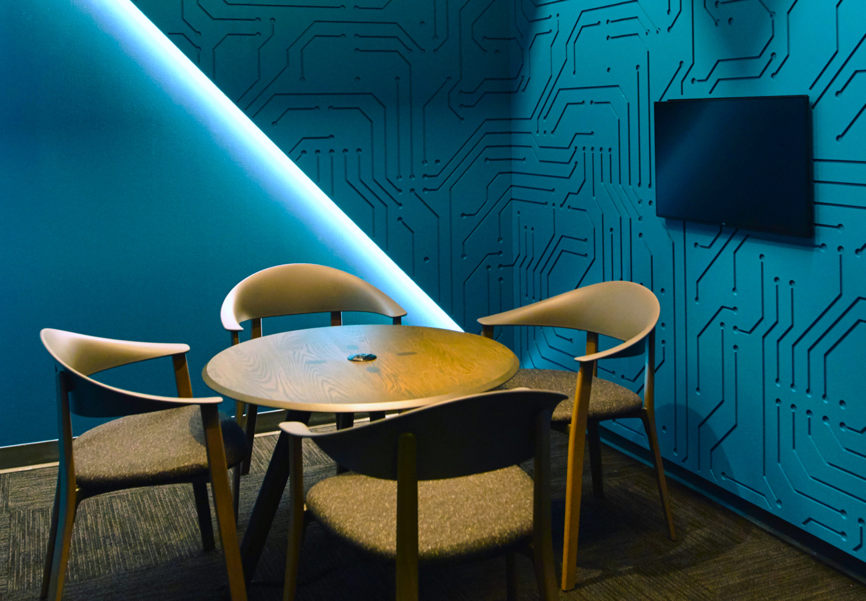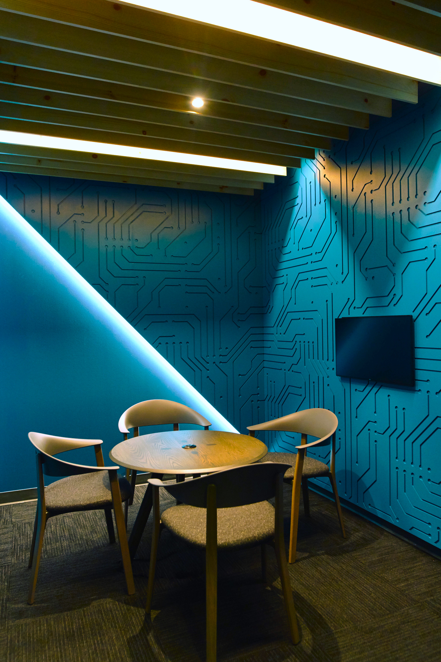 Custom made circuit board feature wall with recessed lighting and a pine slat ceiling.