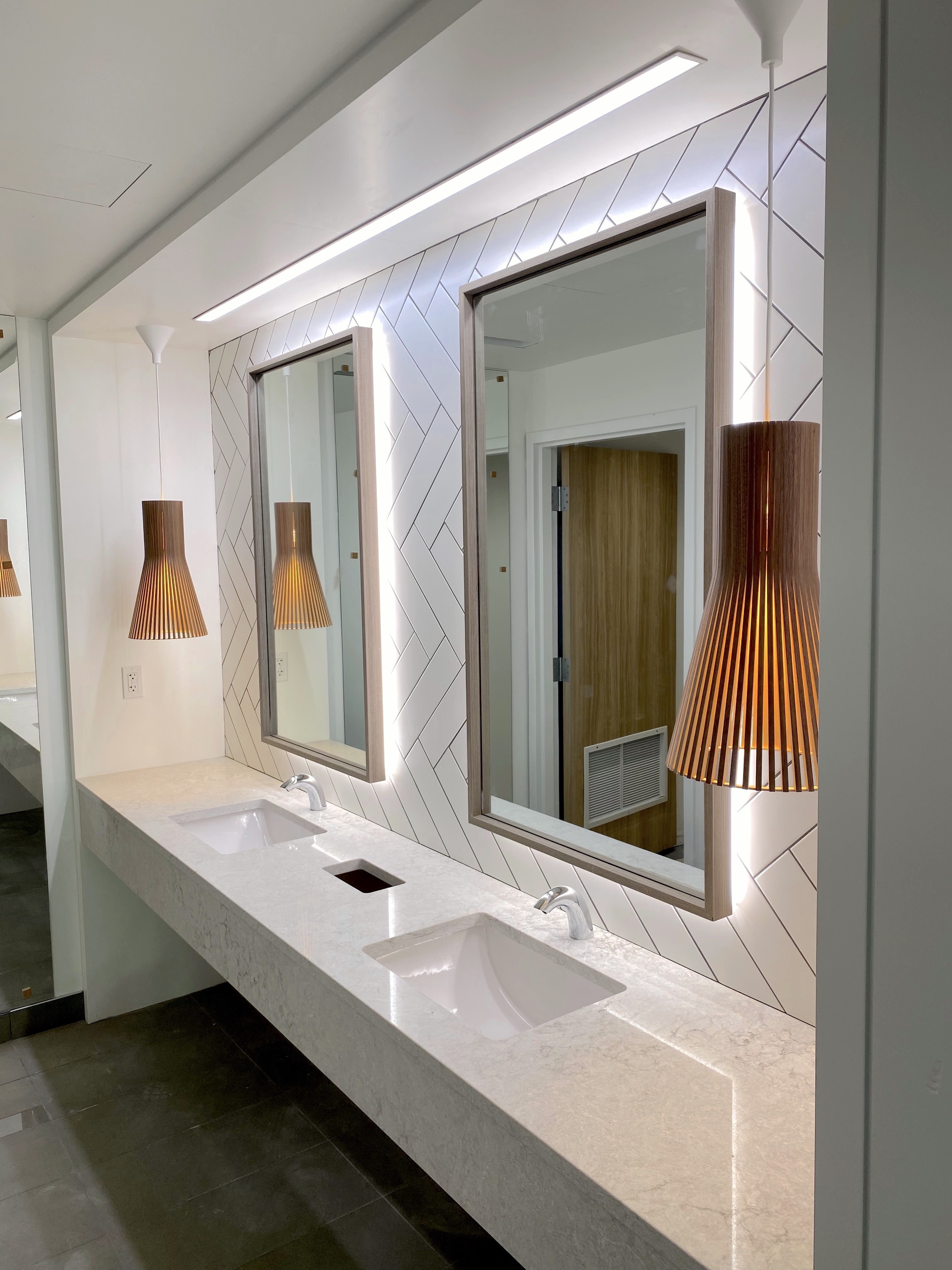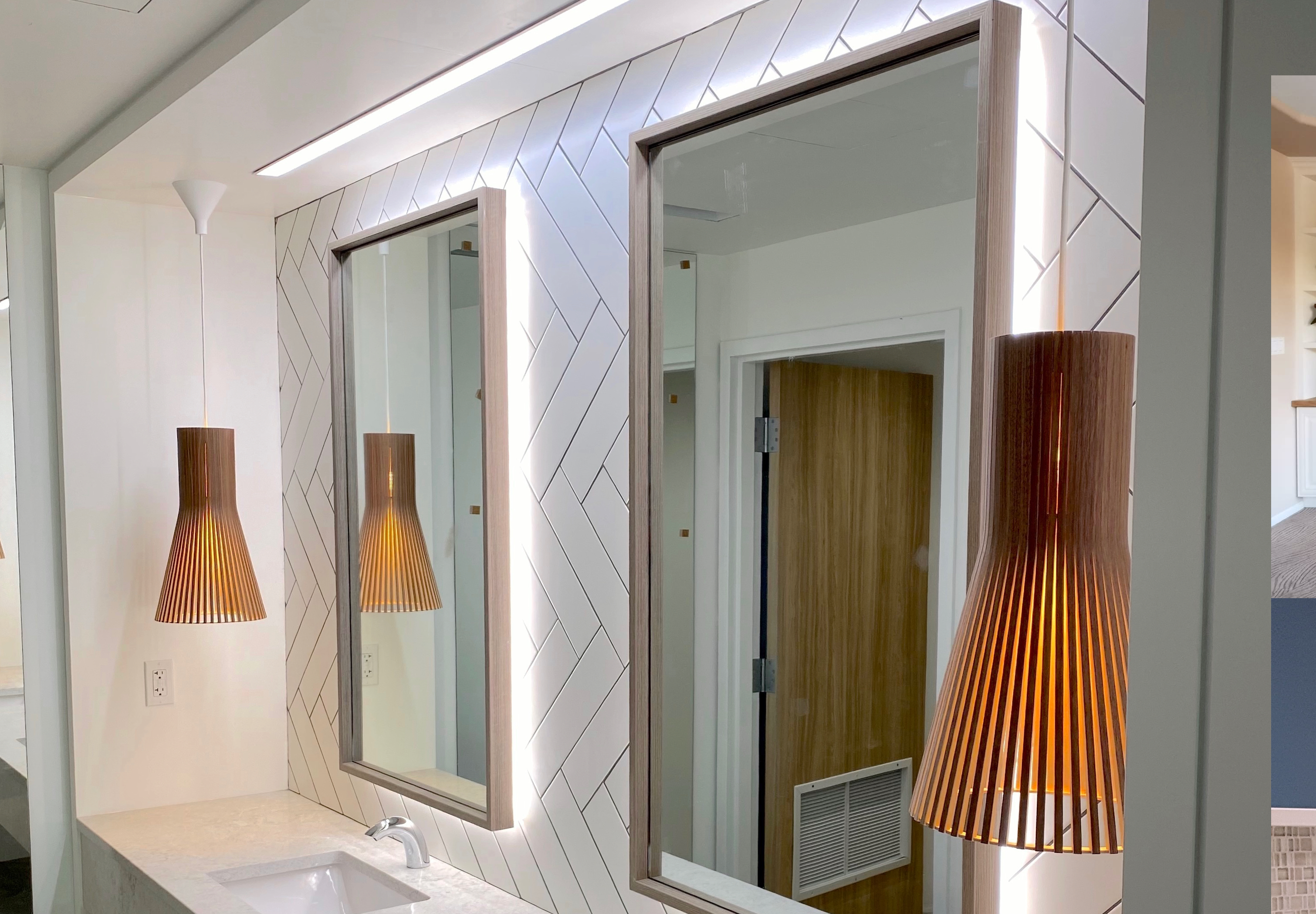 Custom millwork surround with quartz floating bathroom vanities and backlit laminate mirrors.