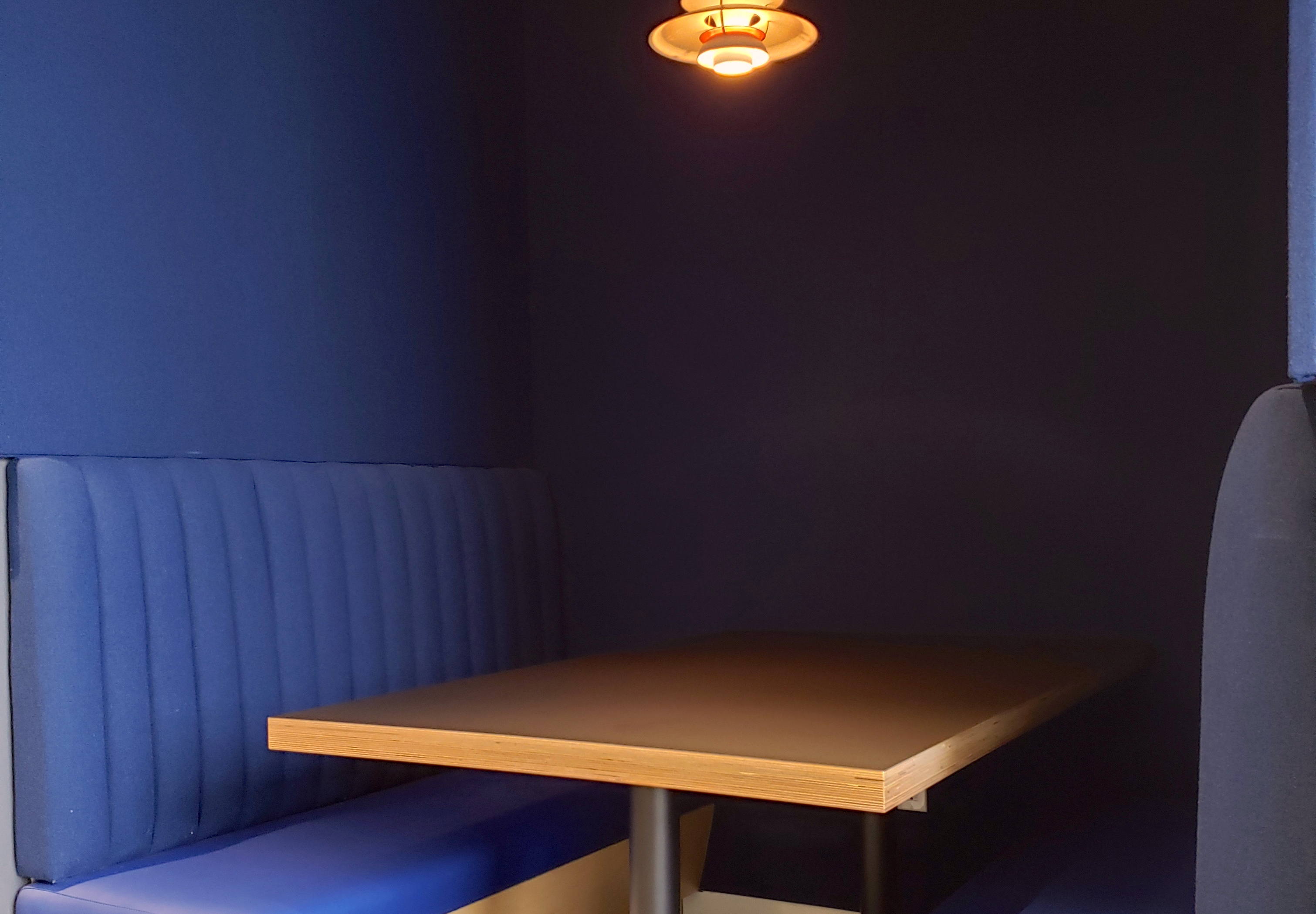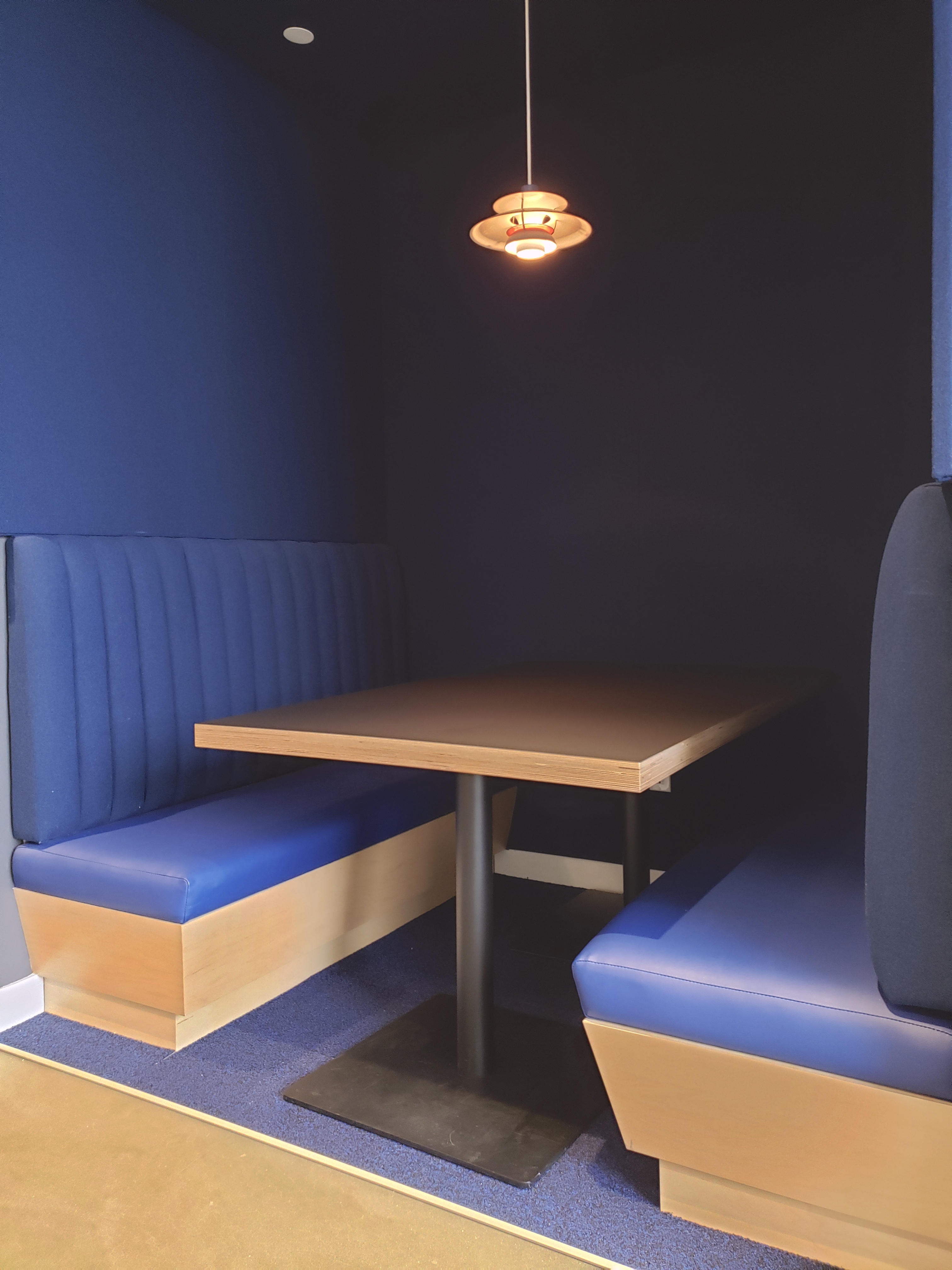 Maple banquet seating with custom upholstered seating, and back and wall surrounds.