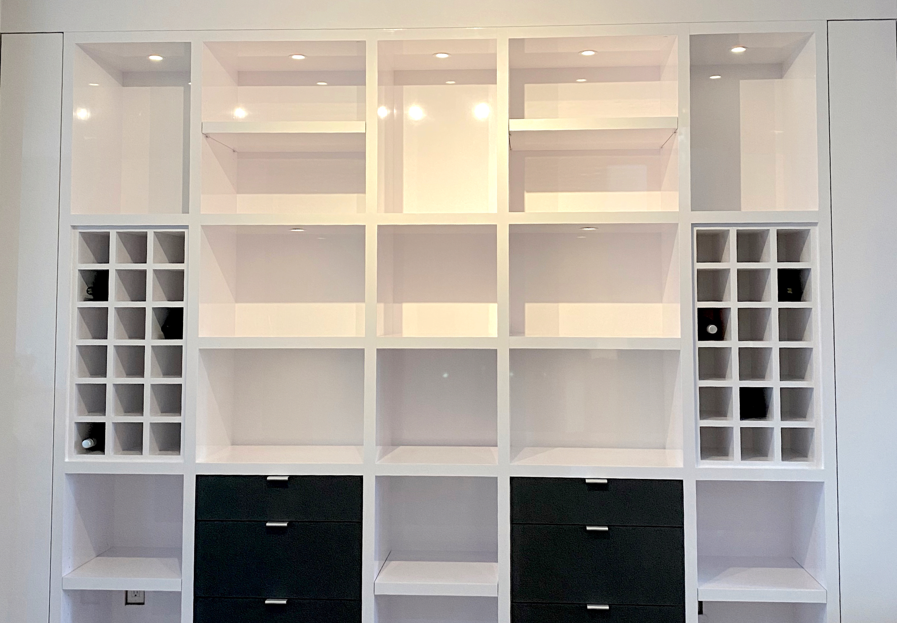 High gloss built-in feature wall with hidden storage, wine racks and shelving.