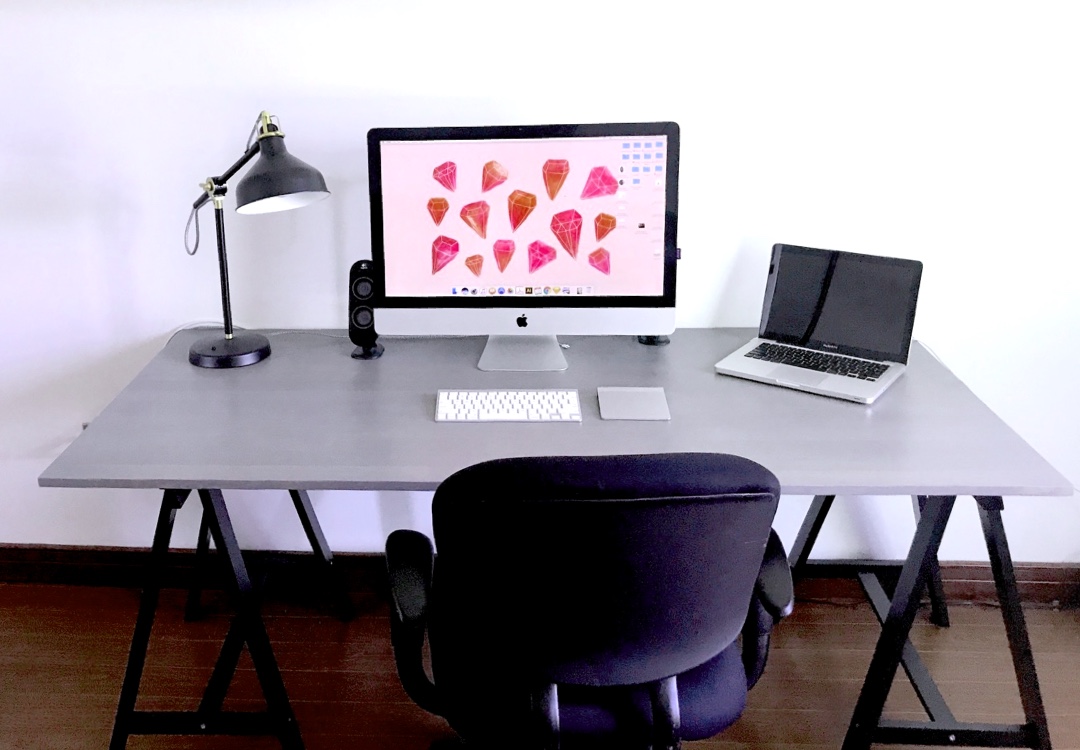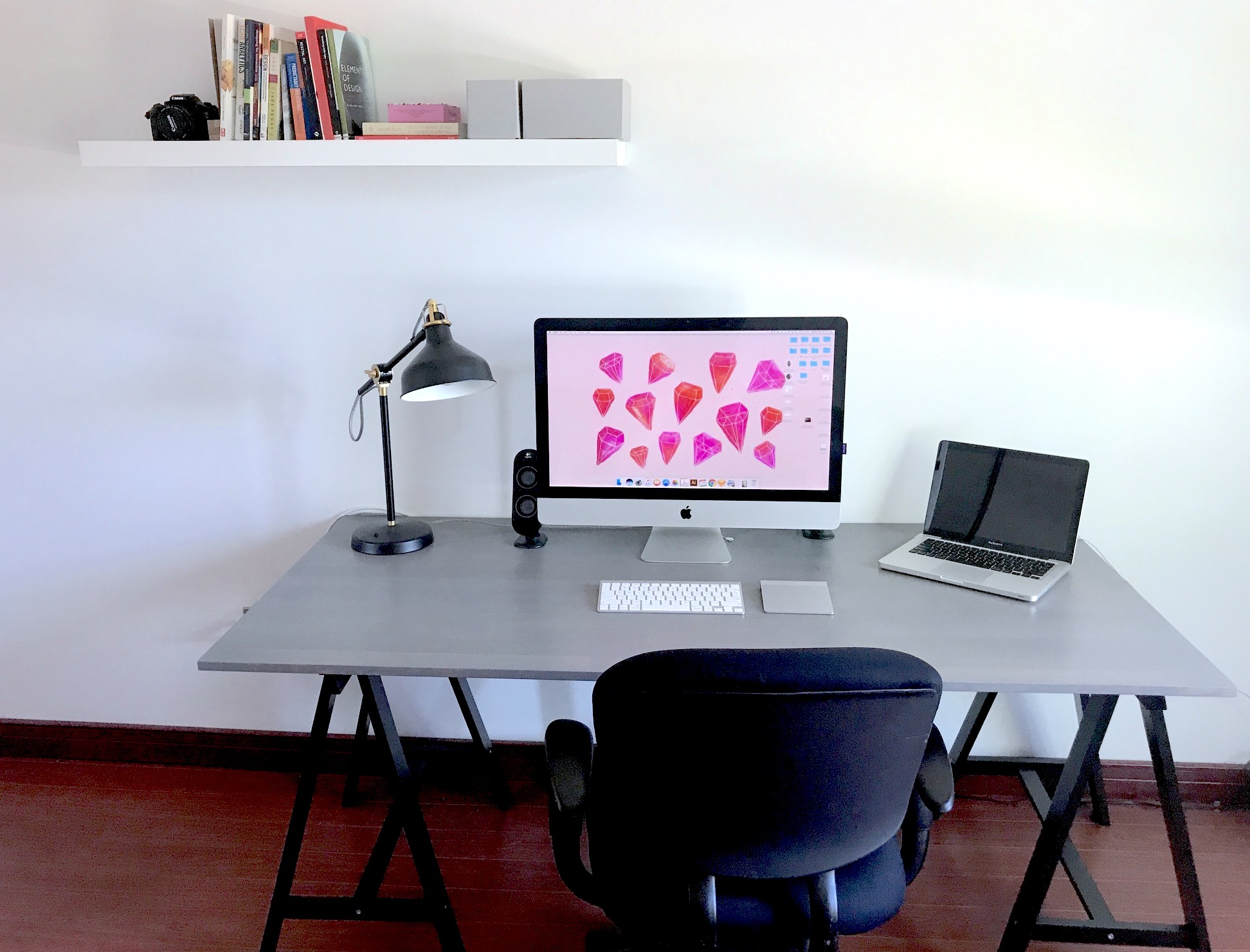 A solid fir desk top stained grey, for a clean minimal aesthetic.